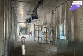 Ежедневно на строительстве объекта трудятся более 80 человек. Работы ведутся во всех помещениях одновременно. Рабочие заняты благоустройством территории, утеплением и облицовкой стен фасада фиброцементными плитами, монтажом покрытия кровли, внутренних перегородок. Идут работы по стяжке полов на 2 этаже, устройству наружных крылец, прокладки наружной канализационной сети, монтажу систем электроснабжения, вентиляции, отопления, водоснабжения и водоотведения внутри здания.