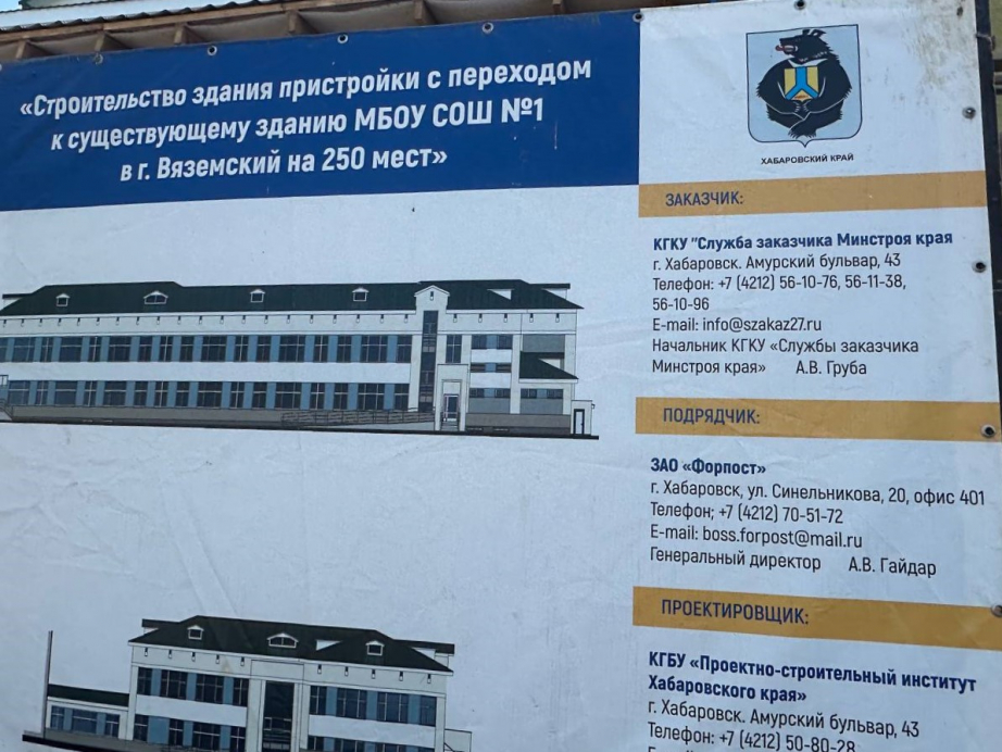 В городе Вяземский продолжается строительство нового здания школы № 1. Вследствие чему администрация учреждения сможет принять еще 250 ребят. Кроме того, благодаря пристройке в школе появятся 10 оборудованных кабинетов и спортивный зал. Строительство ведется в рамках национального проекта "Молодежь и дети", инициированного Президентом России Владимиром Путиным.
